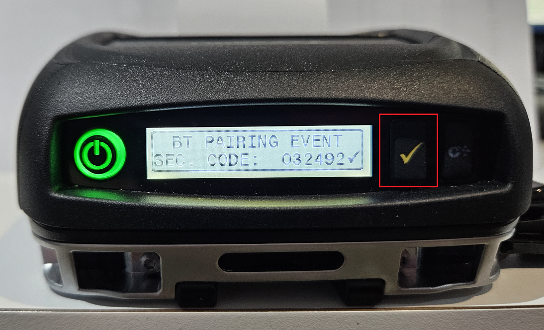 - Apply the settings and then search for the Zebra printer. At this point you may see the following on the printer ... if so press the "tick" button to accept the pairing.